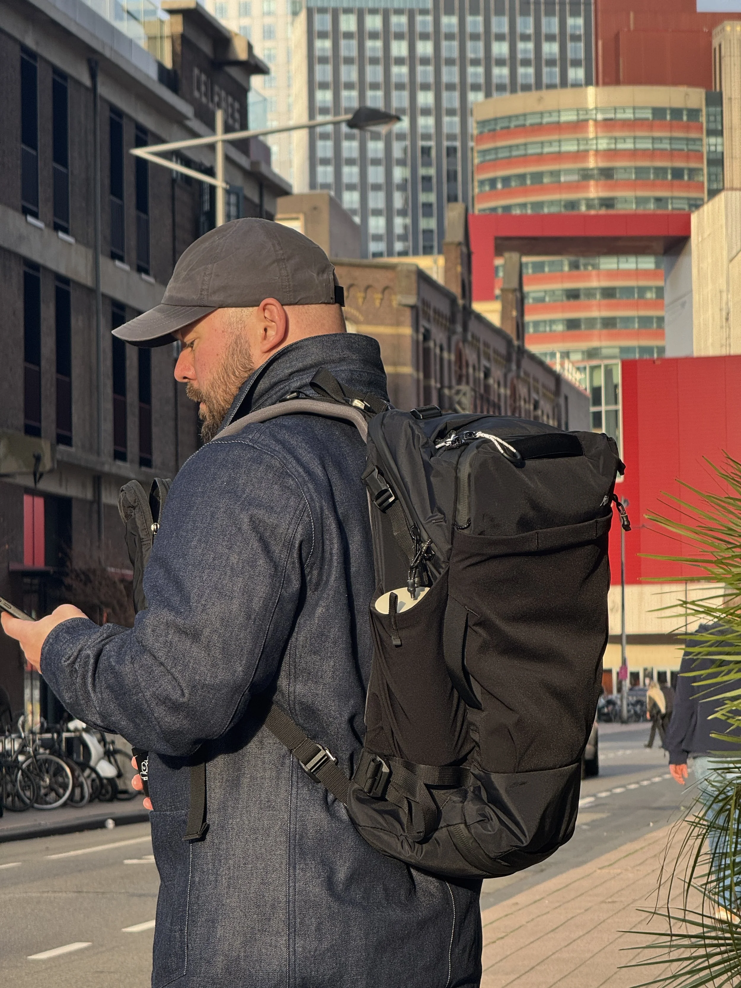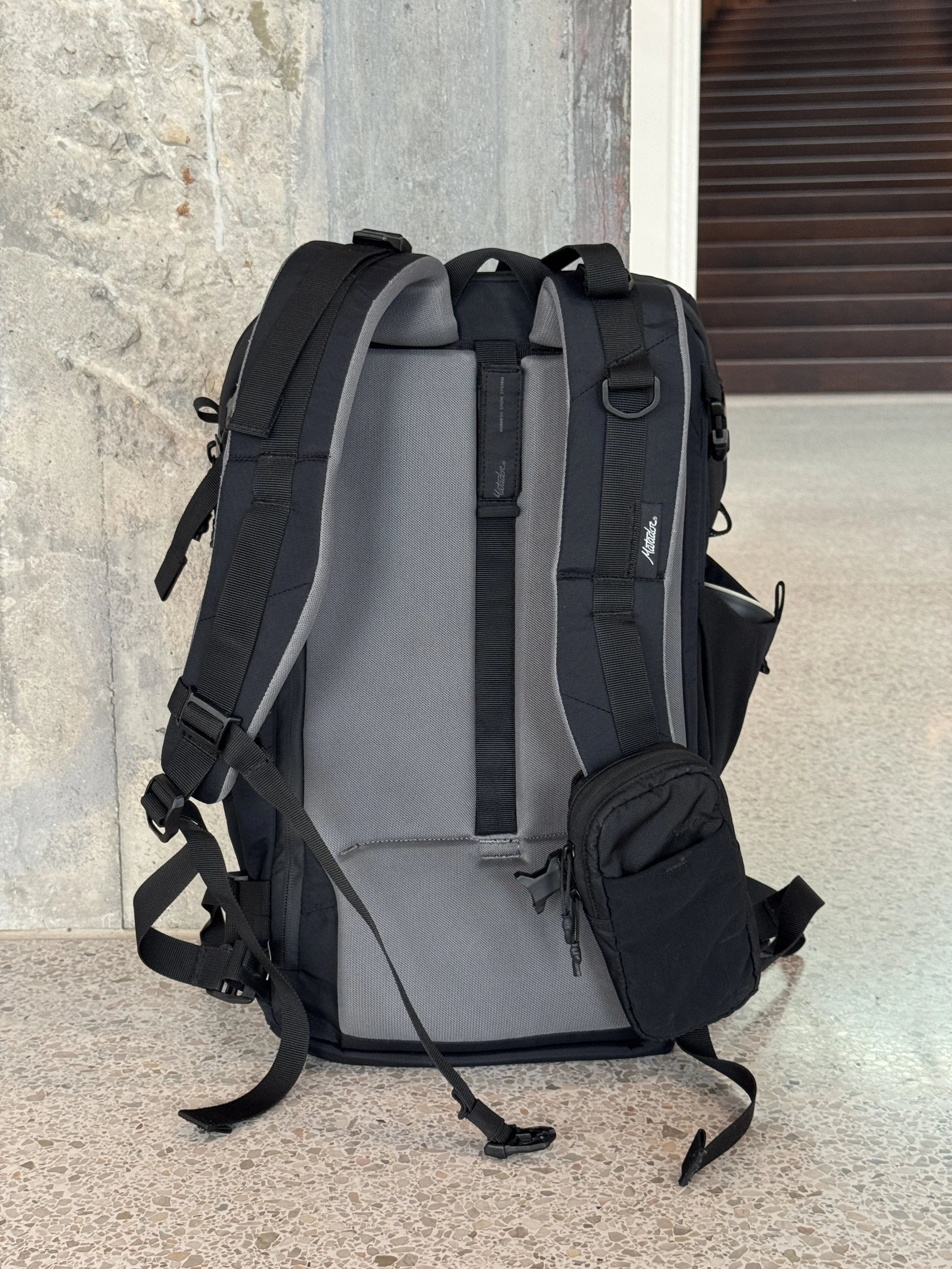 I have to praise Matador’s choice of materials: the Bluesign-certified water-resistant nylon, slick YKK zippers, and Woojin hardware all stand up to scrutiny. The black colorway is “subtle but sexy”—professional in a meeting, unassuming in the wild. Zipper pulls are a tactile treat, especially with the white-compression for quick main compartment ID. Add in coated zips and you’ll never stress a shower or the unexpected Dutch weather that seem to surprise you with rain even when the forecast is mentions no such thing :)
